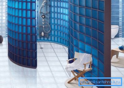 Треба сказати, що до скляних конструкцій входить і душова кабіна з склоблоків. Нагадаємо, що склоблоки - це, по суті, скляні цеглини, з яких можна викласти огорожу будь-якої форми і розмірів. Причому блоки існують різних кольорів, що можна вміло використовувати при оформленні дизайну інтер'єру.