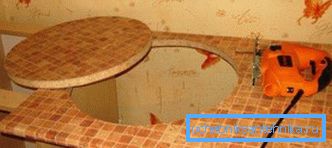- Деякі любителі все робити своїми руками, виготовляють стільниці самостійно. В принципі інструкція тут не складна. Спочатку береться лист водостійкої фанери або OSB і вирізається по потрібному розміру. Зверху на лист, звичайним способом, укладається кахельна плитка. В результаті виходить досить міцна і довговічна стільниця, причому саме тієї форми і розміру, які необхідні.