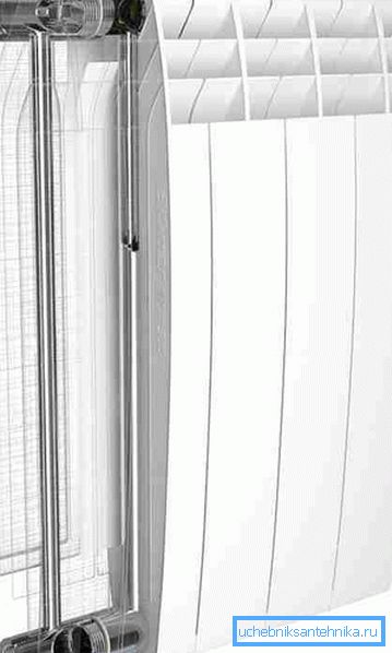 Зверніть увагу! Існують більш дешеві моделі біметалевих виробів, де сталь використовується тільки для облаштування вертикальних каналів. Їх виробники стверджують, що через малу площу контакту алюмінію з теплоносієм окислення (корозії) не відбувається. Практика показує, що це далеко не так, тому краще купувати радіатори з повністю сталевим каркасом, на який надітий алюмінієвий теплообмінник.