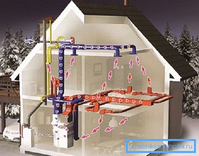 - З природною циркуляцією - перетікання відбувається за рахунок різниці температури, густини і ваги повітря в будинку.