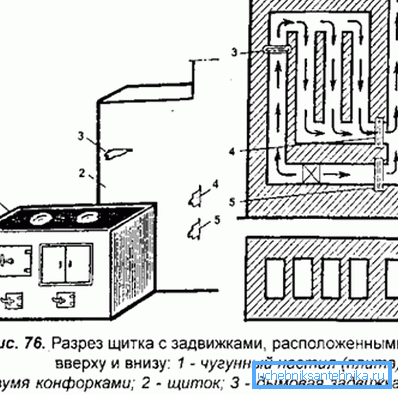 - Щиток являє собою прилаштовуватися до печі невелику цегляну стінку, всередині якої є розвинена система димоходів.