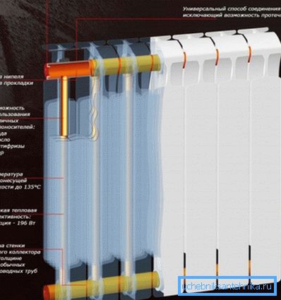 - біметалічні - в більш дешевих моделях комбінується сталь і алюміній (труби зі сталі, а ребра - з алюмінію), в дорогих - мідь + алюміній. Кольорові метали використовуються для підвищення швидкості прогріву опалювального приладу, та й тепловіддача збільшується. Єдиним мінусом можна вважати вартість, ціна медноалюмініевой батареї може в кілька разів перевищувати вартість звичайної чавунної;