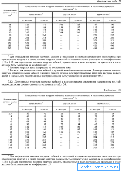 - по ГОСТу 16442-80 підбирається перетин жили, можливі 2 варіанти. Якщо використовується мідь, то жила перетином 4 мм2 цілком підійде, для неї допустима струмова навантаження складе 37 А, так що ще й невеликий запас залишиться. Для алюмінієвих жив доведеться перетин жили збільшити до 6 мм2 - допустима струмова навантаження в такому випадку складе також 37 А.