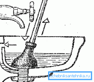 Для цього потрібно помістити гумову частину вантуза над отвором і кілька разів натиснути на ручку пристрою. Попередньо слід закрити переливні отвори, інакше просунути засмічення не вдасться.