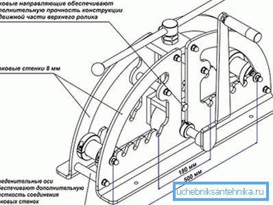 - За допомогою рукоятки вал обертається, і труба рухається між валами, отримуючи певне навантаження на сторону, набуваючи при цьому невеликий радіус вигину.