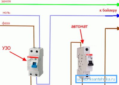 - Ще одна важлива частина робіт - приєднання системи до електричної мережі, схема підключення в цьому випадку повинна передбачати наявність автомата і УЗО. Нижче показаний малюнок, на якому просто і зрозуміло позначені всі головні елементи, важливо не забути про заземлення, так як це обов'язкова умова безпечної експлуатації конструкції.