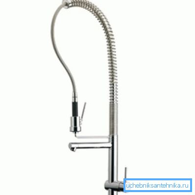 Крім того, існує інший варіант пристроїв, в яких другий виливши зроблений гнучким і висувним. Він дозволяє набирати великі ємності води, ретельно і оперативно вимивати велика кількість овочів і фруктів. Крім того, кран для кухні з гнучким зливом дозволяє обробляти крихкі салатні листя або делікатні ягоди.