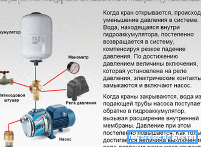 Принцип роботи станції максимально простий. Електричний насос наповнює видатковий бак з водою, таким чином, створюючи натиск в системі водопостачання з колодязя. При відкритті крана на будь-якому споживачеві, тиск в видатковому баку починає знижуватися.
