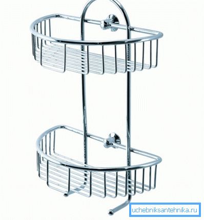 - кутові конструкції користуються величезною популярністю при використанні саме в душах, так як кут найчастіше пустує, і розташувати там зручне місце для зберігання дуже зручно. Варіантів конструкцій і форм сила-силенна, тому вибирати конкретний варіант потрібно безпосередньо в магазині виходячи із запропонованого асортименту. За рахунок форми у таких конструкцій досить велика місткість.