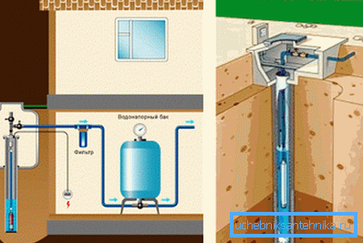 - глибинні - пристрій опускається в саму свердловину. Тому такі насоси мають вузьку циліндричну форму, так як діаметр обсадних труб невеликий. Як вже було сказано вище, глибинні насоси опускаються до середини свердловини, де здійснюють забір води і направляють в зовнішній водопровід.