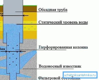 - З подвійною обсадкою - такий пристрій свердловини на вапняк використовується в тому випадку, коли в водоносному шарі недостатній натиск, а у верхньому - є піщані лінзи і глина. Першу обсадку роблять до кордону вапняку, потім проводять другу обсадку з використанням меншого діаметра труб. Вони розміщуються прямо в шарі вапняку, до верхнього горизонту водоносного шару. Є варіанти, коли другу обсадку доводять до кінця водозабору і роблять перфорацію для доступу води в стовбур.