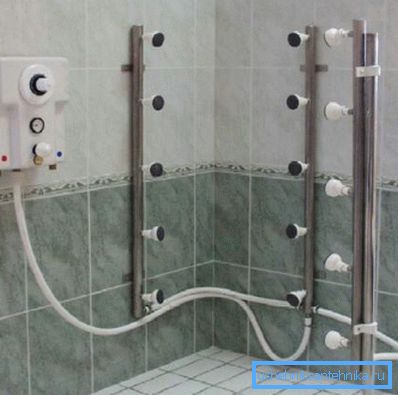 - Душ подібного типу являє собою систему розміщених півколом труб, що мають невеликі отвори по їх внутрішньому периметру. Створювані при їх допомоги водяні струмені дають можливість здійснювати гідромасаж (точковий) всієї поверхні тіла користувача.